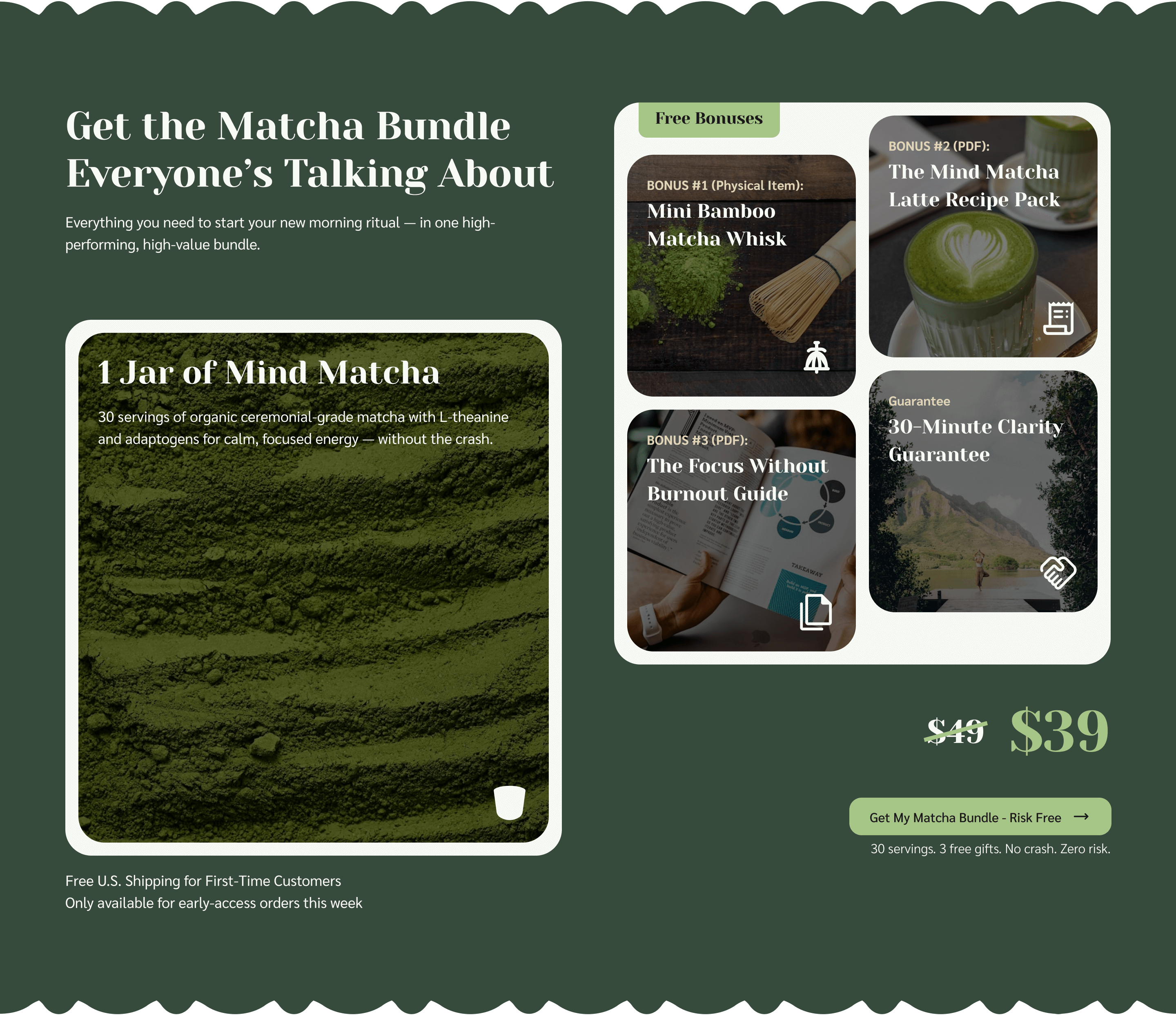 This is where the real offer comes in. It doesn't just show the jar of matcha, it sells the bundle. This section uses bonuses, pricing contrast, and a risk-free guarantee to boost perceived value and push the reader toward action.