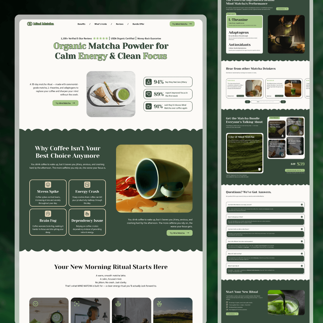 Every section was structured to reduce friction, answer objections, and lead the buyer toward a single, clear action: trying Mind Matcha.